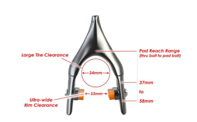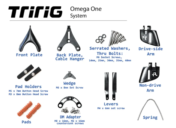 Este freno viene con todo el hardware necesario para montarlo correctamente en su lugar como freno delantero o trasero. Cada freno también incluye un adaptador de montaje directo. El Omega One está diseñado para montaje en tirantes traseros y también para montaje debajo del pedalier. No importa de qué manera lo montes, el Omega One siempre será aerodinámico en cualquier dirección.